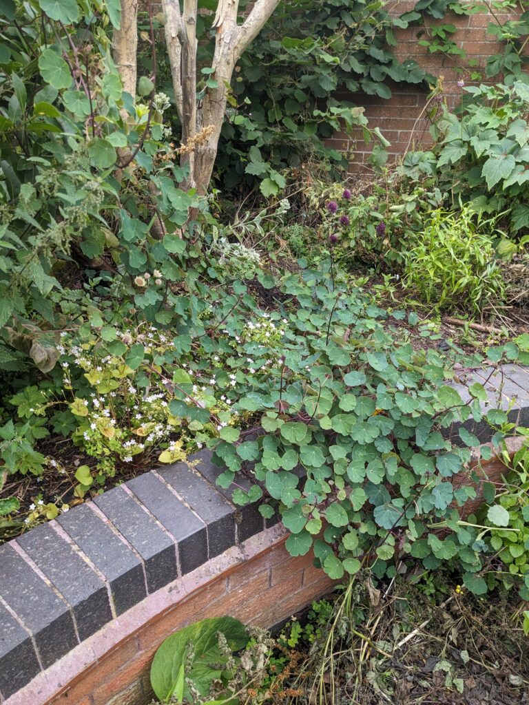 The plants did get rather buried under my mashua plant, which after a slow start, went crazy climbing the bay tree, draping itself over the raised bed wall (which is what I wanted it to do) but also covering a lot of the garden bed. I rearranged the mashua tendrils today and was pleased to see that the purslane is still growing strong. While you would expect this plant to have pink flowers, and in some photos that I have seen, it does, mine has white flowers with a hint of pink.