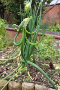 Egyptian walking onions, or topset onions, are somewhere between a spring onion and a shallot. However they have the added benefit of replicating themselves by sending out shoots with multiple bulbils on. These can be harvested to eat or replant, or left to their own devices to spread themselves around the garden (hence the name “walking”). Some bulbils produce their own shoots and baby bulbils before they are even on the ground, giving the plant a rather alien appearance!